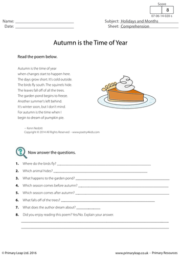 Reading Comprehension Autumn Is The Time Of Year Teaching Resources
